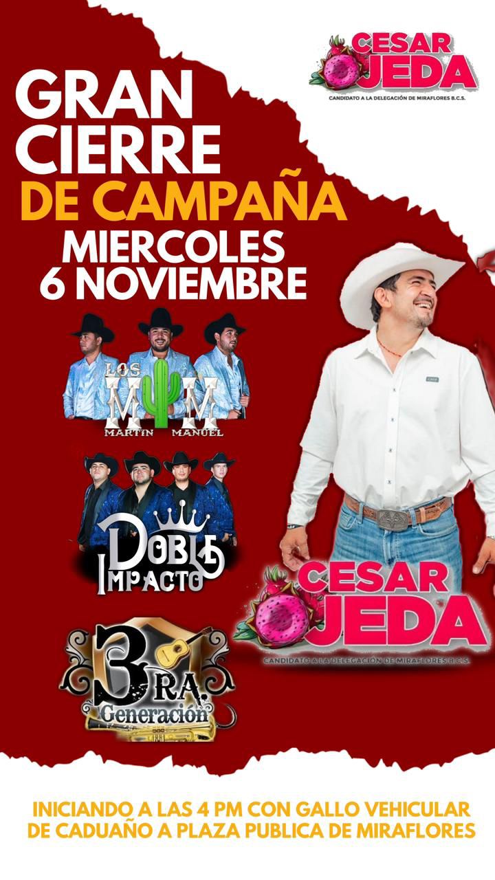 Gran Cierre de Campaña César Ojeda y Grupos en Vivo Miércoles 6 de Noviembre Inicia con Gallo Vehicular desde Caduano hasta Miraflores