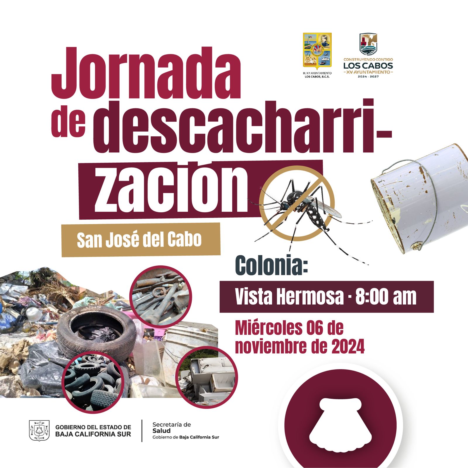 El Ayuntamiento de Los Cabos, en coordinación con el Gobierno del Estado de Baja California Sur y la Secretaría de Salud, realizará una jornada de descacharrización en la colonia Vista Hermosa, San José del Cabo. El evento se llevará a cabo el miércoles 6 de noviembre de 2024, a partir de las 8:00 am, con el objetivo de eliminar criaderos de mosquitos y mantener el entorno limpio y seguro para la comunidad. Se invita a los residentes a participar activamente y a deshacerse de objetos inservibles como llantas, electrodomésticos y recipientes acumuladores de agua.