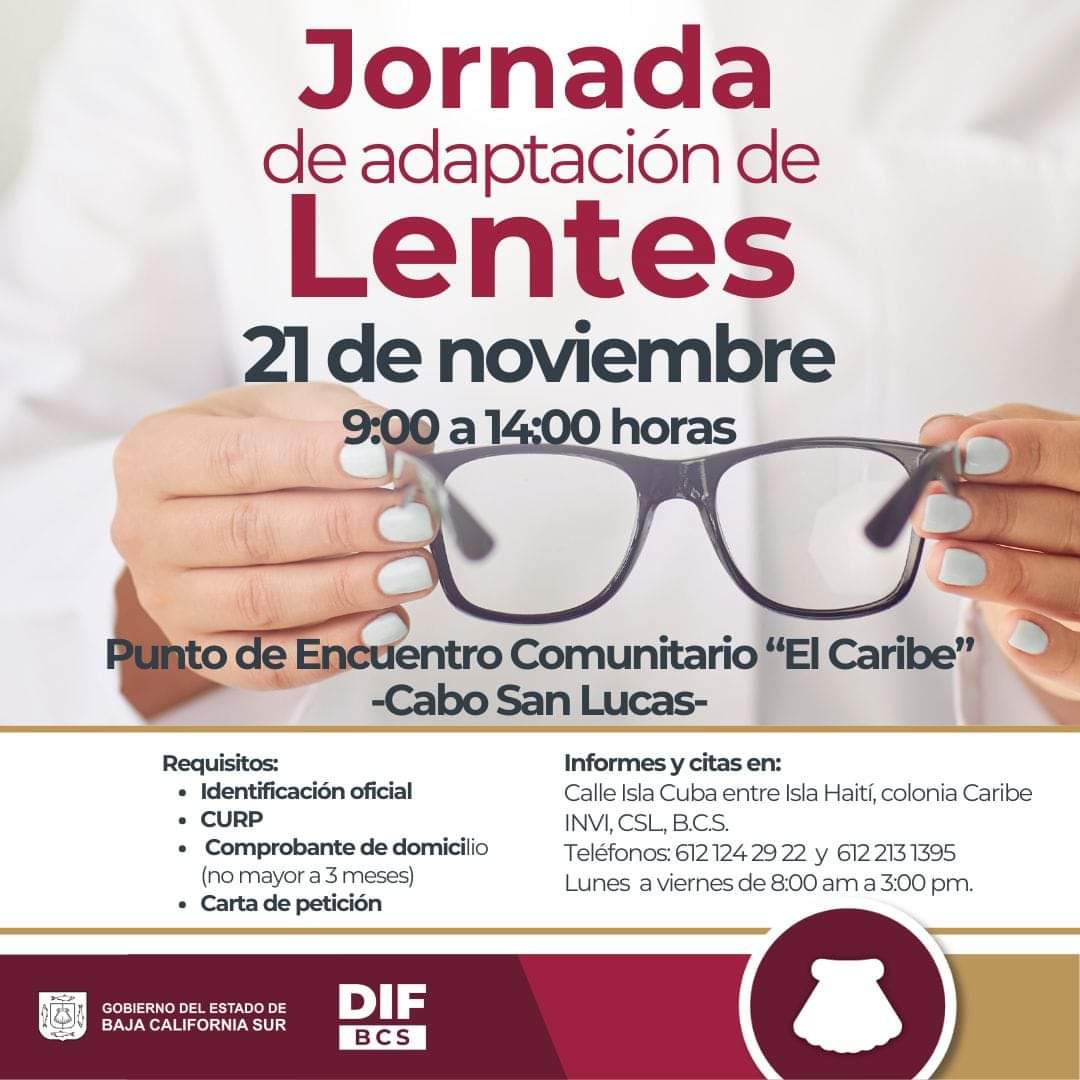 El próximo 21 de noviembre, de 9:00 a 14:00 horas, se llevará a cabo una Jornada de Adaptación de Lentes en el Punto de Encuentro Comunitario “El Caribe”, ubicado en Cabo San Lucas. Este evento es organizado por el DIF de Baja California Sur y está dirigido a la comunidad que necesite apoyo visual.